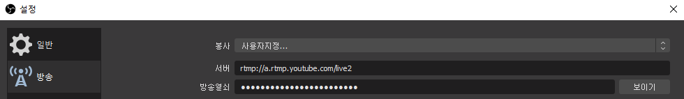 각 플랫폼별 서버 주소 유튜브 : rtmp://a.rtmp.youtube.com/live2 트위치 : rtmp://live-sel01.twitch.tv/app/ 아프리카 TV : rtmp://rtmpmanager-freecat.afreeca.tv/app/ 카카오 : rtmp://rtmp.play.kakao.com/kakaotv 페이스북 : rtmp://rtmp-api.facebook.com:80/rtmp